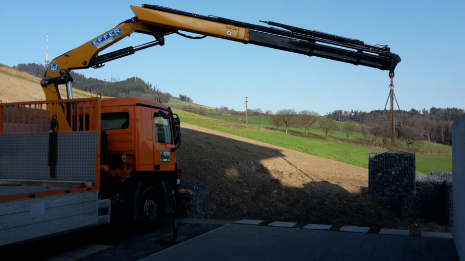 3-Achs Lastwagen mit Ladekran und fester Ladebrücke. Ideal für Materialtransport oder Container auch in Kombination mit Anhänger zum Beliefern von Baustellen.